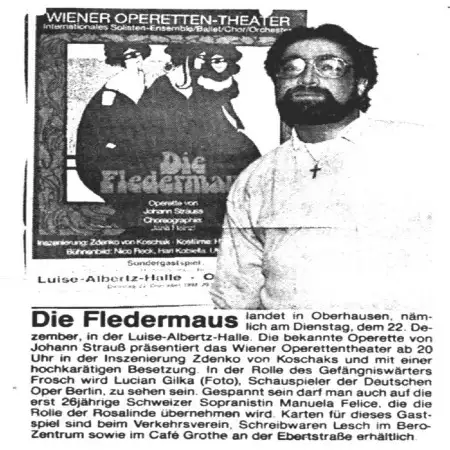 Das war und ist eine meiner Lieblingsrollen - der Gefängniswärter "Frosch" in der Operette "Die Fledermaus". Dank meinem Mentor Vincent Grabowsky, Direktor des Scala Theaters Basel, der auch Intendant und Leiter des "Wiener Operetten-Theaters" war, konnte ich mit dieser Rolle insgesamt 3 Jahre auf Tourneen in Holland, Belgien, der Schweiz, Israel und auch natürlich durch Deutschland gehen. Ob im "CCH" in Hamburg oder im "ICC" Berlin vor ausverkauften Häusern mit mehr als 2000 Zuschauern oder in kleinen Kurorten auf kleinen Bühnen - es macht einfach immer wieder Spaß!